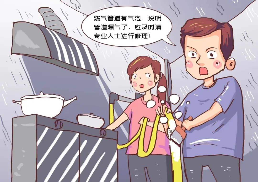 (1)燃氣泄漏。當嗅到臭味時,液化石油氣可能已出現(xiàn)泄露,此時應斷絕一切明火,將肥皂水涂抹鋼瓶的角閥、調壓器、灶具開關和膠管等處檢查,如果涂抹處冒出氣泡,說明已經漏氣,應立即關閉鋼瓶角閥,打開門窗通風,禁止使用手機或碰觸電器開關,移至通風安全處向供氣單位報修。
